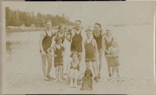 Scope & Content: Photograph depicts nine people in bathing suits standing in front of the ocean. A dog can also be seen. Pictured second from the left in the back row is Vivien (Wrathall) Comadina and pictured forth from the left in the back row is Jack Wrathall.