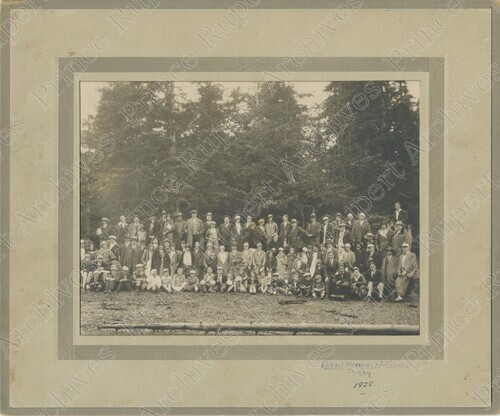 Scope & Content: Photograph depicts people gathered for a retail merchants picnic. Pictured in the back row is Mrs. McMeekin, Tom McMeekin, Margaret McMeekin, Bill Watts, P.H. Linzey, John Bulger, Fred Cameron, Mrs. Cameron, Mrs. Morgan, Connie Morgan, Jack Wrathall, Cleo Mussallem, Audrey Wrathall, Bill Lambie (in front of Cleo Mussallem and Audrey Wrathall) Creedy Morgan, C. Orme, R.C. Benson, and George Munro. Pictured in the middle row is Marie Mussallem, Jack Mussallem, Tom Trottier, George Johnstone, Cliff Ham, Mrs. P. H. Linzey, Phyllis Hill, Mrs. George Hill, Mrs. Wrathall, Ken Wrathall, Cathy M. Meekin, Cathy Watson, Mrs. Irvine, J. S. Irvine and Bert Morgan. Pictured in the front row is Helen Green, Vivian Wrathall, Eileen Hamblin, Phylis Hamblin, Russell Cameron, Dick Wrathall, Bobby Reid, Jack Mussallem, Bert Cameron and Johnny Saunders. Also seen is Harry Birch, Louis Avol, Neil Cameron, Bill Ranse, Bill Wilson-Murray, Steve King, George Dawes, William Barton, Percy Tinker, Jack Paul, Ben Dalgarno, Charlie Youngman, John Bulger, D. McPhee, Sid Thompson, Frank Dibb, Jack Judge, George Hill, Tom McMeekin, Bill Reid and Jock Little.