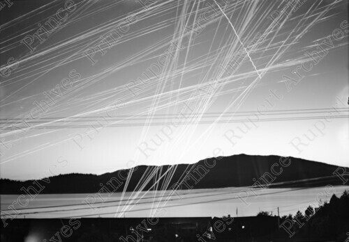 Scope & Content: Photograph depicts tracer bullets being used in target practice over the harbour. Handwritten annotation on recto of copies 3 and 4 reads: "Target Practice. Tracer Bullets. Rupert Harbour. 1941." Stamped annotation on verso of copies 2, 3 and 4 reads: "Photo by Jack Wrathall Prince Rupert, B. C."