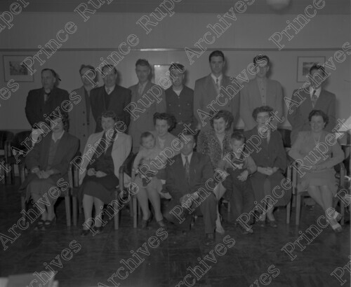Scope & Content: Photograph depicts a group of seventeen people gathered together for a Prince Rupert Fishermen's Co-operative Association meeting. The group includes two children. Handwritten annotation on recto of copies 2 and 3 reads: "Co-op Meeting - Apr - 1951. Pr. Rupert, B.C." Stamped annotation on verso of copies 2 and 3 reads: "Photo by Jack Wrathall Prince Rupert, B. C."