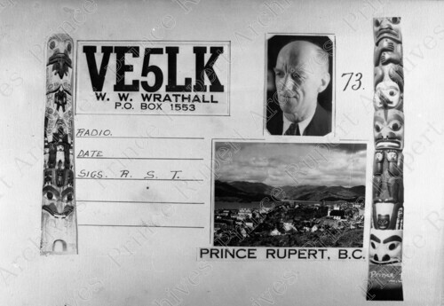 Scope & Content: Photograph depicts the ham operator card of William Wrathall giving his operator number and location and showing a photograph of two First Nations people.