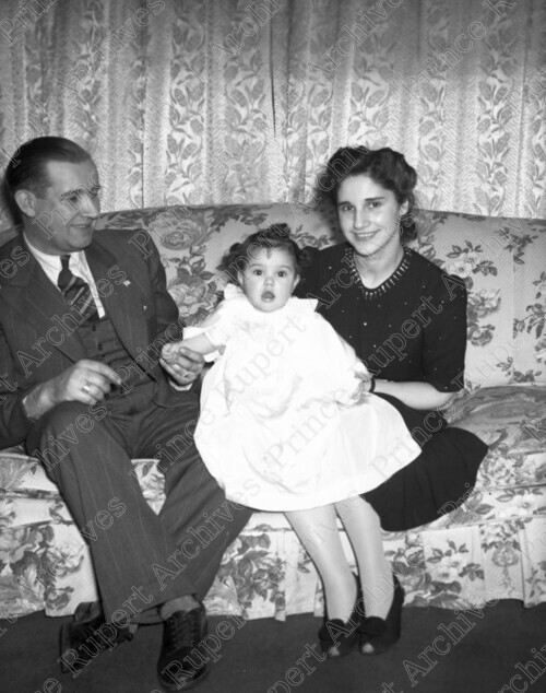 Scope & Content: Photograph depicts Mr. and Mrs. Gordon and Cleo Bryant with their baby girl Susila. Handwritten annotation on recto of copy 2 reads: "Cleo Mussallem. Mr. & Mrs. Gordon Bryant & Baby. 1945." Stamped annotation on verso of copy 2 reads: "Photo by Jack Wrathall Prince Rupert, B. C."