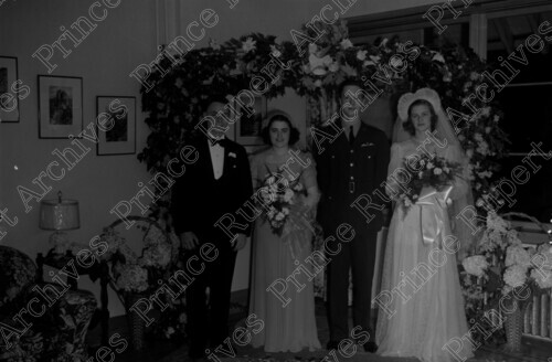 Scope & Content: Photograph depicts the bride, a man in a military uniform, a woman and a man at the wedding of June Hankinson. Ellen Moore is pictured second from the left and June Hankinson is pictured farthest on the right. June was Dr. Hankinson's daughter. Handwritten annotation on recto of copies 3 and 4 reads: "Miss Ellen Moore. Dr. Hankinson's Daughter June. Mr. & Mrs. 1945." Stamped annotation on verso of copies 3 and 4 reads: "Photo by Jack Wrathall Prince Rupert, B. C."
