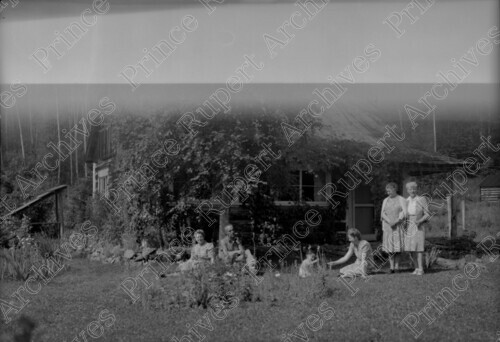 Scope & Content: Item consists of Bert Bartlett, his wife and four other people (including a child) outside of a house.