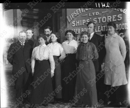 Scope & Content: Item consists of a group of men and women standing outside of Lipsett, Cunningham & Co. Ltd. Ships' Stores in the Clapp Block on the 100 block of 2nd Avenue West. Handwritten annotation on recto of copy 2 reads: "1916. Lipset's [sic] Ship's Stores. 100 Blk - 2nd. Ave. Clapp Blk." Stamped annotation on verso of copy 2 reads: "Photo by Jack Wrathall Prince Rupert, B. C."