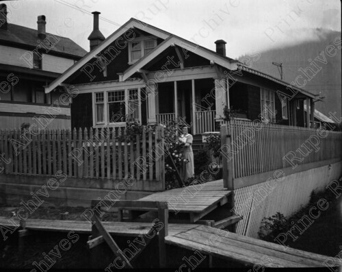 Scope & Content: Item consists of a house on the 200 Block of 5th Avenue East. A woman can be seen standing outside of the house. Handwritten annotation on recto of copy 2 reads: "Dybhavn's Res. 218 - 5th. Ave. E. 1916." Stamped annotation on verso of copy 2 reads: "Photo by Jack Wrathall Prince Rupert, B. C."