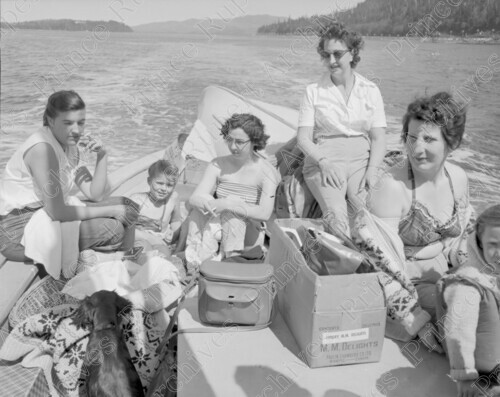 Scope & Content: Item consists of a group of people, and a dog, in a boat with food for a picnic at Tremayne Bay. The group includes Mary Wrathall and Babs Wrathall.