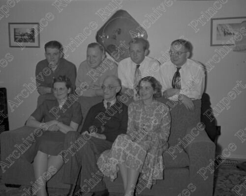 Scope & Content: Item consists of seven members of the Wrathall family gathered around a sofa.