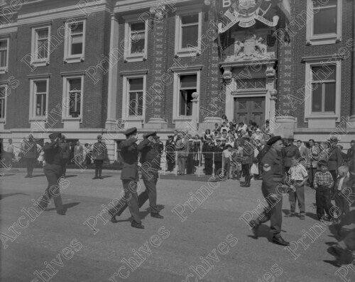 Scope & Content: Item consists of of men marching in a parade as part of the B.C. Centennial celebrations. The marchers, and crowds of onlookers, are in front of the Prince Rupert Courthouse on Market Place. The B.C. Centennial flag, which is not pictured, is being raised in front of the Courthouse. Handwritten annotation on recto of copy 2 reads: "At Raising Centennial Flag. Court House. 1958." Stamped annotation on verso of copy 2 reads: "Photo by Jack Wrathall Prince Rupert, B. C."