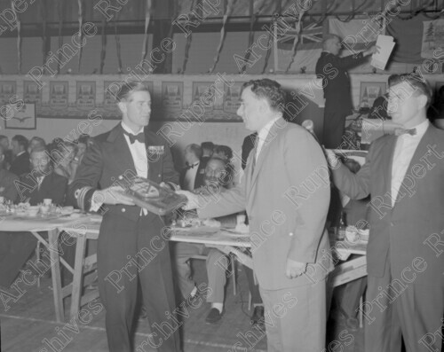 Scope & Content: Item consists of three men at a Navy Dance at the drill hall on 1st Avenue West. More people can be seen in the background. The second man from the left is Mayor Peter Lester and the third man from the left is Art Murray. Handwritten annotation on recto of copy 2 reads: "1- 2. Mayor - Pete Lest. 3. Art Murray. Navy Dance. At Drill Hall. 100 Blk. 1st. Ave. W. June 18 - 1958." Stamped annotation on verso of copy 2 reads: "Photo by Jack Wrathall Prince Rupert, B. C."