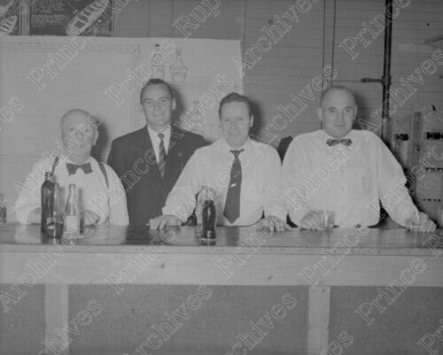 Scope & Content: Item consists of four bartenders at a navy dance at the navy drill hall on 1st Avenue West. The bartenders are, from left to right: Billy Rance, Jerry Lemire, an unidentified man and Mr. Fletcher.