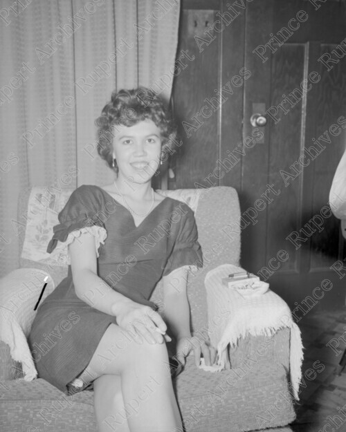 Scope & Content: Item consists of Ada Lou Bell sitting on a chair at a party held by Marilyn Anderson at an unknown location. Handwritten annotation on recto of copy 2 reads: "Feb. 1 - 1963." Stamped annotation on verso of copy 2 reads: "Photo by Jack Wrathall Prince Rupert, B. C."