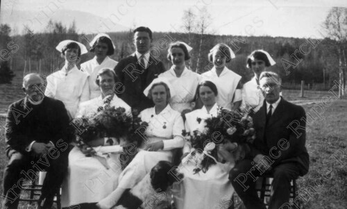 Scope & Content: Item consists of a group of doctors and nurses gathered together. Pictured in the front row farthest on the right is Dr. W. T. Kergin and pictured in the back row third from the left is Dr. R. G. Large. Also included in the picture is Mrs. Sherwood, and Dr. Horace C. Wrinch. Handwritten annotation on recto of copies 2 and 3 reads: Front Row - No - 1. 2. 3. 4. 5. Dr. W. T. Kergin." Stamped annotation on verso of copies 2 and 3 reads: "Photo by Jack Wrathall Prince Rupert, B. C."