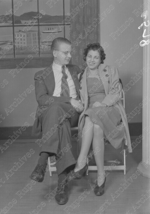 Scope & Content: Item consists of Jack Wrathall and Marie Mussallem sitting in chairs at an unknown location. Handwritten annotation on recto of copy 2 reads: "Jack Wrathall. Marie Mussallem. 1936." Stamped annotation on verso of copy 2 reads: "Photo by Jack Wrathall Prince Rupert, B. C."