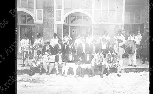 Scope & Content: Item consists of a group of 24 Moose Lodge members with their faces painted black gathered outside of a building on the 200 Block of 3rd Avenue for a parade. Four of the members are carrying musical instruments
