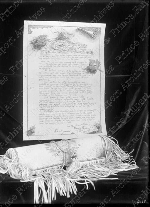 Scope & Content: Item consists of a letter, written in French, from Canadiens Francis de Prince Rupert et de Camarade (French Canadians and people of Prince Rupert) to Prime Minister Wilfrid Laurier and signed by Damase Sigouin. A rolled up moose hide etching by Mort Craig can also be seen.