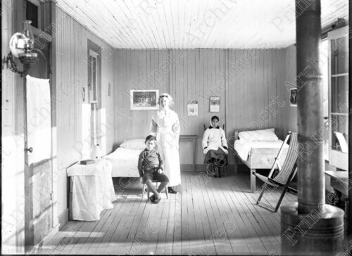 Scope & Content: Item consists of a nurse, a boy and a girl in a room at the quarantine hospital on the 500 Block 4th Avenue East.