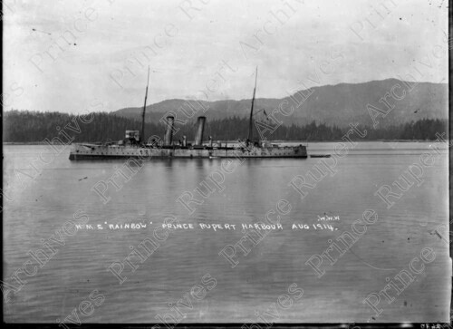 Scope & Content: Item consists of the H.M.S. "Rainbow" in the Prince Rupert harbour. Caption just below the centre of the photo reads "H.M.S. "Rainbow" Prince Rupert Harbour Aug 1914." Caption on the lower left side of the photo reads "W.W.W."