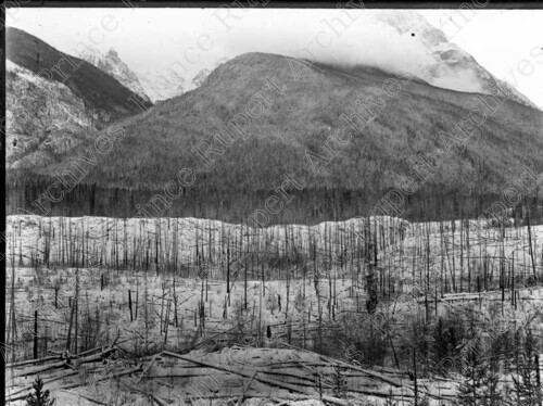 Scope & Content: Item consists of trees burned in a forest fire with a mountain in the background.