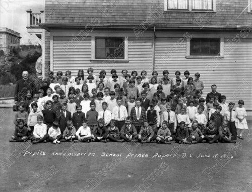 Scope & Content: Item consists of a large group of students, teachers and priests gathered in front of Annunciation School. Caption near the bottom of the photo reads "pupils Annunciation School Prince Rupert B.C June 18. 1926."