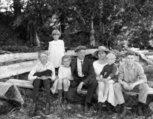 Scope & Content: Item consists of a man, a woman and their five children sitting on a log at a family picnic.
