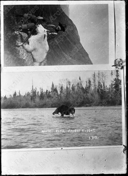 Scope & Content: Item consists of a contact sheet with a hunter holding a rifle and the body of a mountain goat and a moose standing in a body of water. Caption on near the bottom of the moose photo reads "Moose near Prince Rupert I. BC."