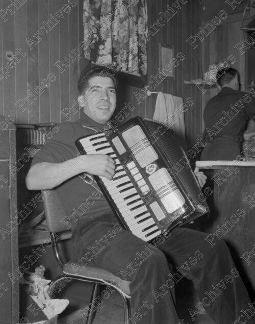 Scope & Content: Item consists of a man sitting on a chair and playing the accordion at a party at the home of Bill and Jean Murdock on Ambrose Avenue. Another man can be seen in the background. Handwritten annotation on recto of copy 2 reads: "At Jean & Bill Murdock's." Stamped annotation on verso of copy 2 reads: "Photo by Jack Wrathall Prince Rupert, B. C."