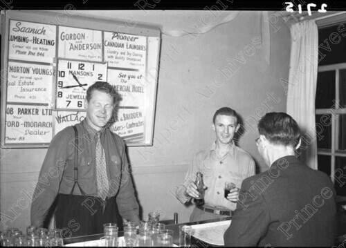 Scope & Content: Item consists of three men standing around a counter with drinking glasses lying on it. The man looking away from the camera may be Jim Ciccone. A large clock can be seen on a wall.