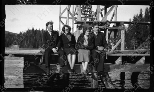 Scope & Content: Item consists of Pete and Bertha Peterson and two of their friends sitting on the base of the diving board at Salt Lakes. Bertha and Peter Peterson are pictured third and fourth from the left respectively.