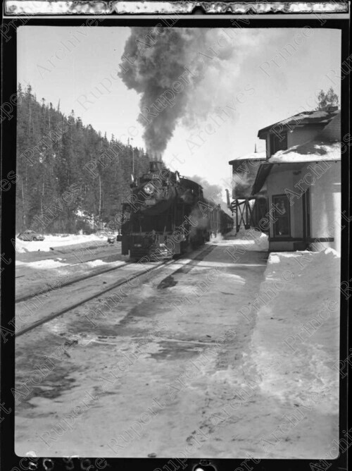 Scope & Content: Item consists of the CNR train number 2701 at the Tyee railway station during the winter. The water tower can be seen behind the station on the right. Handwritten annotation on recto of copy 2 reads: "At Tyee Station. 1950." Stamped annotation on verso of copies 2 and 3 reads: "Photo by Jack Wrathall Prince Rupert, B. C."