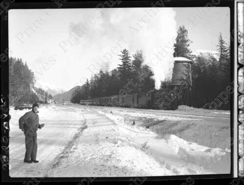 Scope & Content: Item consists of a CNR train driving in front of a water tower during the winter. Johnny Comadina can be seen standing on the left. Handwritten annotation on recto of copy 3 reads: "At Tyee Station. Johnny Comadina. 1950." Stamped annotation on verso of copy 3 reads: "Photo by Jack Wrathall Prince Rupert, B. C."