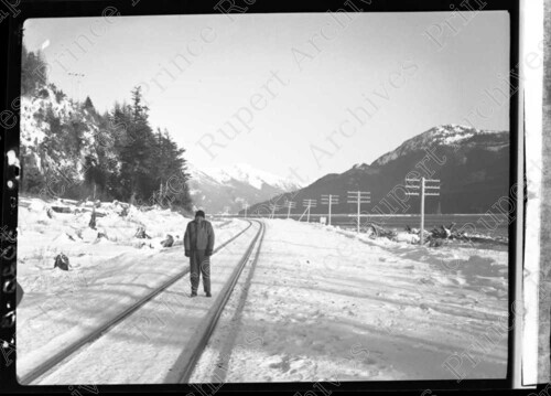 Scope & Content: Item consists of John Comadina standing on railway tracks during the winter. A mountain and the Skeena River can be seen in the background. Handwritten annotation on recto of copy 3 reads: "Just East of Tyee. Cold Morning John Comadina. 1950." Stamped annotation on verso of copy 3 reads: "Photo by Jack Wrathall Prince Rupert, B. C."