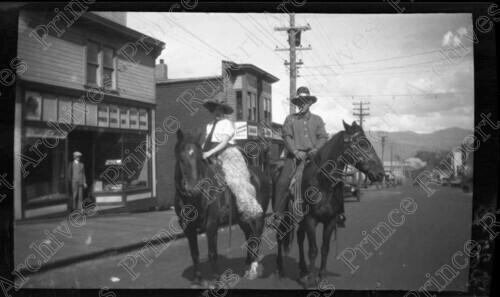 Scope & Content: Item consists of a man and a woman dressed as cowboys riding horses on the 300 Block of 3rd Avenue West. The Canadian Legion of the BESL building at 312 3rd Avenue West can be seen in the background. The cowboys are visiting from a rodeo in Telwa, B.C. Handwritten annotation on recto of copy 2 reads: "Cow Girl & Cow Boy - From Telkwa. For Rodeo - on 300 Blk 3rd. Ave." Stamped annotation on verso of copy 2 reads: "Photo by Jack Wrathall Prince Rupert, B. C."