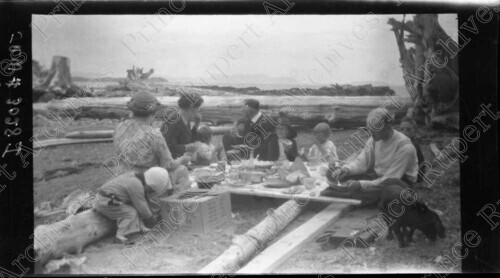 Scope & Content: Item consists seven people and a dog at a picnic at Tugwell Island.