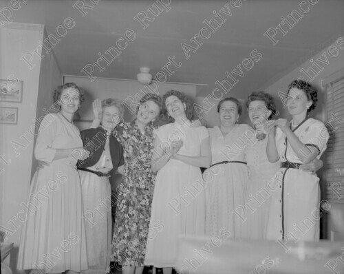 Scope & Content: Item consists of a group of seven women at a party at the home of Jackie and Dick Heal on 6th Avenue East. Pictured from left to right is: Mrs. Henry Linseth, Jackie Heal, Kay Linseth, Lorna Wrathall, Nellie Anderson, Molly Lawrence and Faye Gilmore. Handwritten annotation on recto of copy 2 reads: "1. Mrs. Linseth. 2 Jackie Heal. 3. Linseth. 4. Lorna Wrathall. 5. Nellie Anderson. 6. Molly Lawrence. 7. Faye Gilmor [sic]. 1960." Stamped annotation on verso of copy 2 reads: "Photo by Jack Wrathall Prince Rupert, B. C."