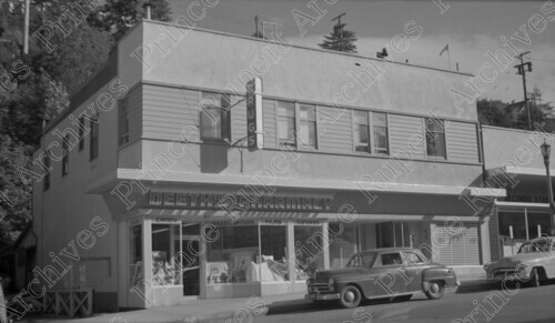 Scope & Content: Item consists of a view of Deeth's Pharmacy and Jerry's Barber Shop on the 300 block of 3rd Avenue West. A record store can also be seen on the right.