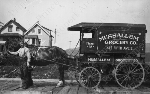 Scope & Content: Item consists of a horse drawn delivery cart for Mussallem Grocery Co. at 417 Fifth Avenue East. Handwritten annotation on recto at the bottom of the photo reads "417 Blk. 5th Ave. E. 1915."