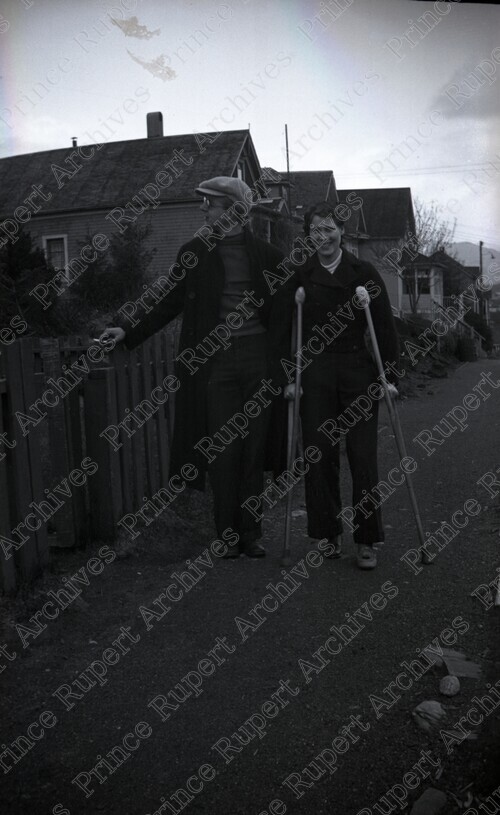 Scope & Content: Item consists of Jack Wrathall standing with his wife Lorna Wrathall. Lorna is supported by two crutches. A row of houses can be seen in the background.