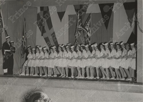Scope & Content: Item consists of Job's Daughters dancing on the stage at the Civic Centre on 2nd Avenue and McBride Street. Two sea cadets standing on the side of the stage. One of the girls on stage is Mary Giske. Stamped annotation on verso of copies 1, 2, 3, 4 and 5 reads: "Photo by Jack Wrathall Prince Rupert, B. C."