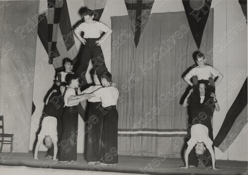 Scope & Content: Item consists of Sea Cadets performing gymnastics on the stage at the civic centre on 2nd Avenue and McBride Street. Handwritten annotation on verso reads: "Photo by Jack Wrathall Prince Rupert, B.C."