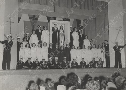 Scope & Content: Item consists of members of Job's Daughters and Sea Cadets performing a play at the civic centre. Stamped annotation on verso reads: "Photo by Jack Wrathall Prince Rupert, B.C."