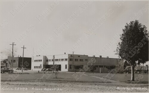 Scope & Content: Item consists of a view of the civic centre on 2nd Avenue. Handwritten annotation on verso of copies 1 and 2 reads: "Civic Centre Prince Rupert BC. Photo by Wrathall." Typed annotation on verso of copy 2 reads: "Customer's Originals Enclosed."