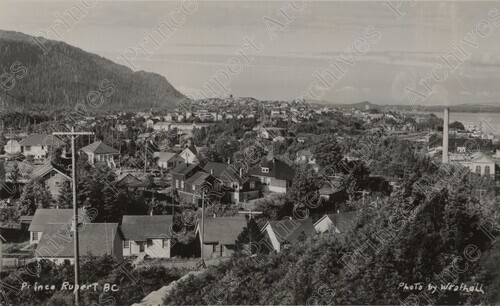 Scope & Content: Item consists of a panoramic view of Prince Rupert. The view includes houses and the Prince Rupert Drydock and Shipyard can be seen on the right. Handwritten annotation on recto reads: "Prince Rupert BC. Photo by Wrathall."