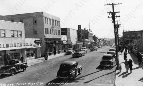 Scope & Content: Item consists of a view 3rd Avenue West including Overwaitea, Wallace's Department Store and the Capitol Theatre. Handwritten annotation on recto reads: "3rd Ave. Prince Rupert BC. Photo by Wrathall."