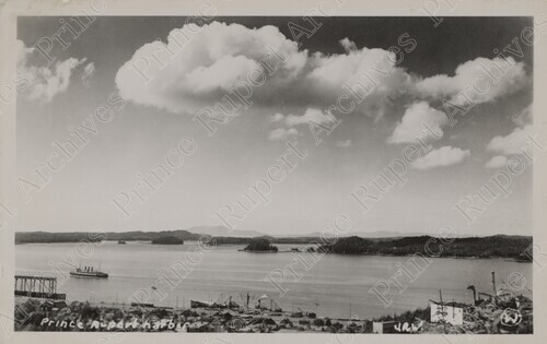 Scope & Content: Item consists of a view of the Prince Rupert waterfront beyond Five Corners at the intersection of First and Second Avenues and Park Avenue. A steamship can be seen floating in the harbour on the left. Handwritten annotation on recto reads: "Prince Rupert Harbor. J.R.W. W."