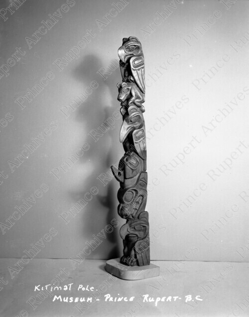 Scope & Content: Item depicts a miniature Kitimat totem pole on display in the museum of Northern British Columbia. Handwritten annotation on recto read: "Kitimat Pole. Museum - Prince Rupert - B.C."