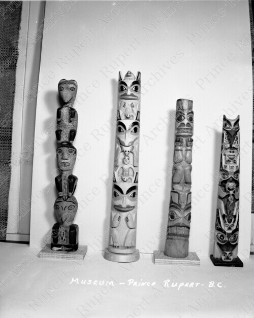 Scope & Content: Item consists of four miniature totem poles on display at the Museum of Northern British Columbia. Handwritten annotation on recto reads: "Museum - Prince Rupert - B.C."