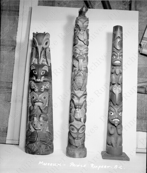 Scope & Content: Item consists of three miniature totem poles on display at the Museum of Northern British Columbia. Handwritten annotation on recto reads: Museum - Prince Rupert, B.C."