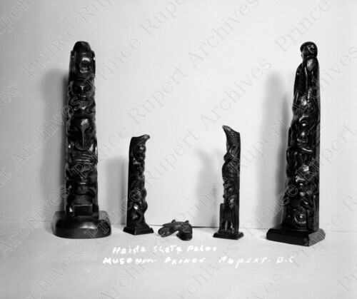 Scope & Content: Item consists of four First Nations miniature carved Haida, Argillite (slate) totem poles on display in the Museum of Northern B.C. Handwritten annotation on recto reads: "Haida Slate Pole Museum - Prince Rupert, B.C."