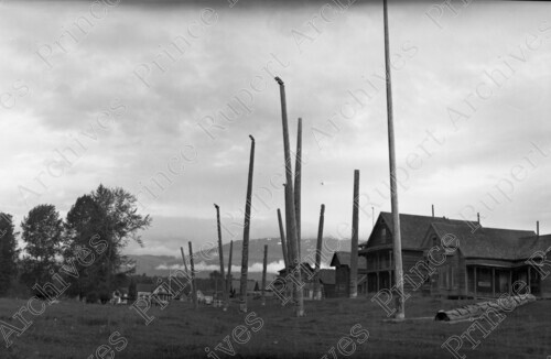 Scope & Content: Item consists of fourteen totem poles in front of houses. The pole farthest on the right has fallen over.